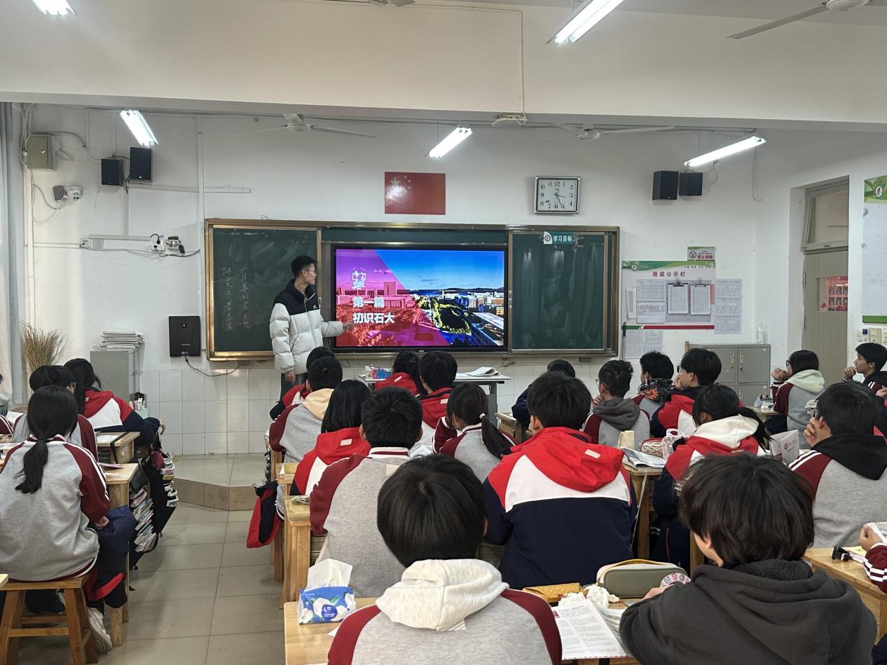 随后,实践团成员针对学校和学院进行招生宣传。通过播放校园宣传片,展示了学校的现代化教学设施、校园环境以及丰富多彩的校园文化活动。同时,实践团成员还分享了自己大学的学习经历、社团活动以及科研实践项目,为同学们答疑解惑,让昌乐一中的同学们对高校的学习生活有了更直观的了解。