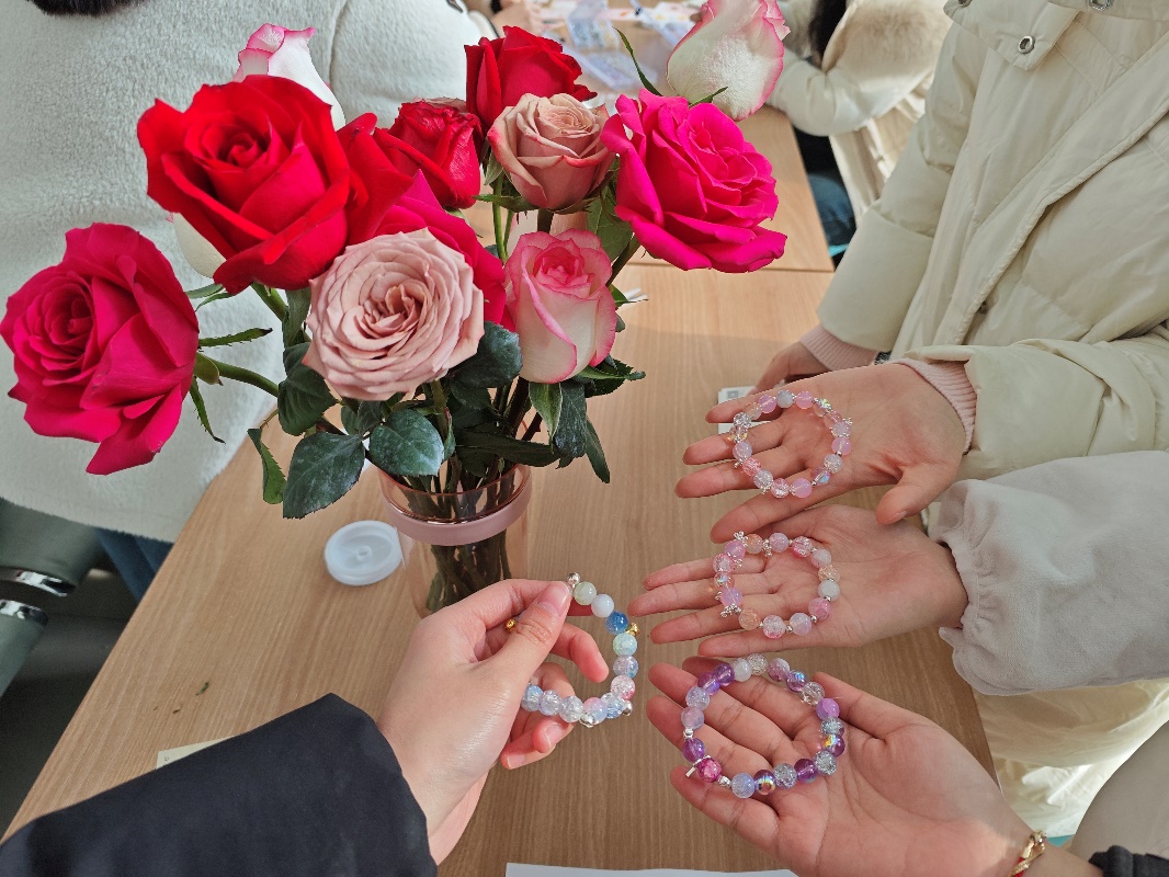 活动现场布置温馨,洋溢着浓厚的节日氛围。在“思美节鲜花”环节中,每位参与者通过抽奖形式领取鲜花,并且都可以选取自己喜欢的卡片,大家通过这一简单而美丽的举动表达了彼此的喜悦。与此同时,手工串珠环节也成为了活动的一大亮点。参与者们挑选自己喜爱的珠子,亲手制作成精美的手链,不仅为自己增添了一份独特的节日礼物,也可以将这份心意送给他人。通过亲手创作,大家在活动中收获了愉悦与满足,同时也增进了彼此之间的友谊。