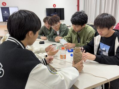 在创意实践环节,团支部成员们利用提前准备好的废旧塑料瓶、剪刀、麻绳、热熔枪等材料,充分发挥创意,将塑料瓶用热熔枪和剪刀制成篮状,用麻绳缠绕瓶身,再点缀花纹图案,将多肉植物栽培在其中制成花篮,不仅环保而且实用美观。在制作过程中,团支部成员保轲表示,“没想废弃的塑料瓶,经过手工改造能够变成如此实用漂亮的花篮,不仅减少了垃圾,还为周围生活增添了美感。”团支部成员们将创意与环保理念完美融合,体验“变废为宝”的乐趣与意义。