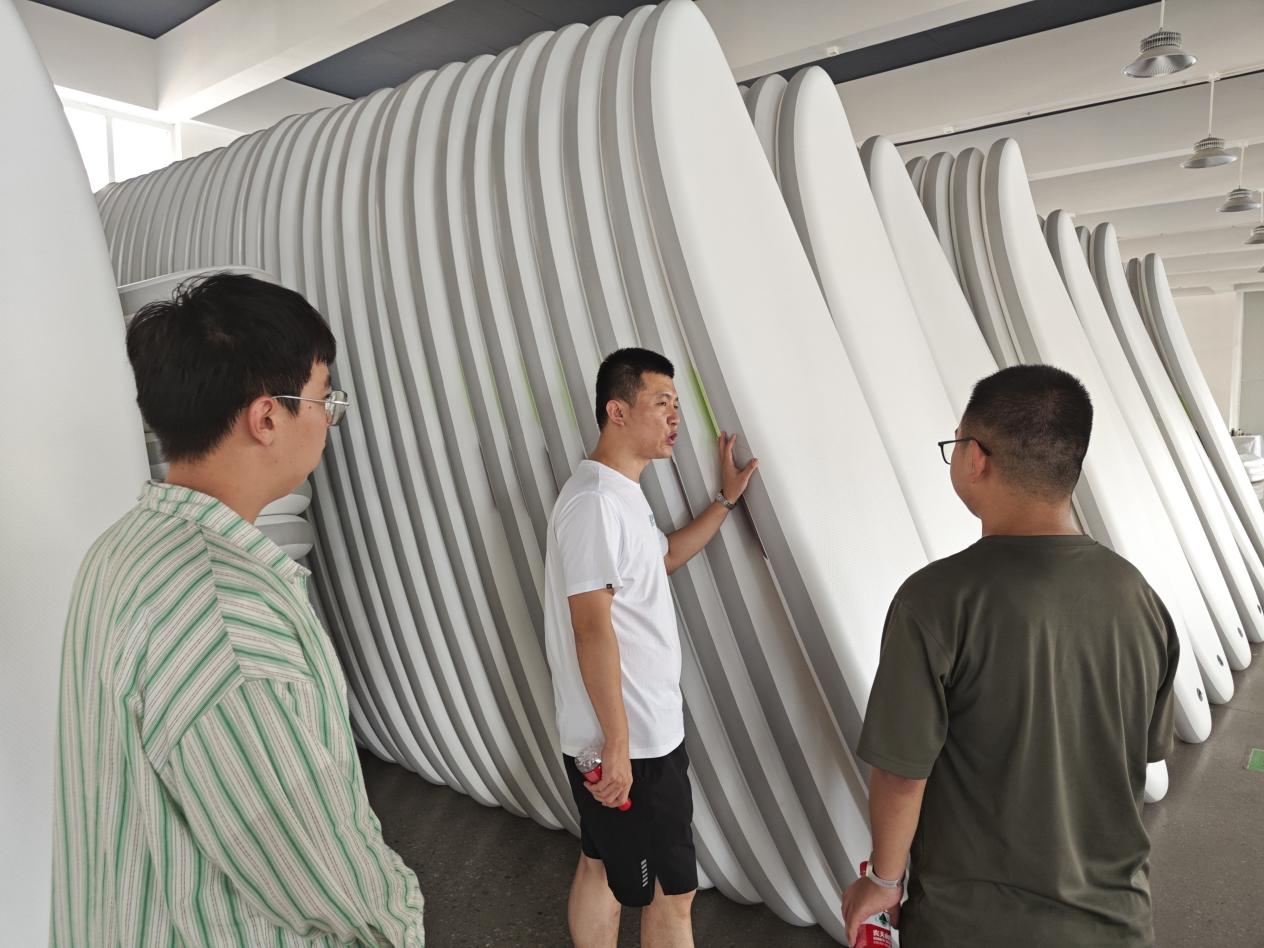 调研期间,队员们系统对比了企业展厅陈列的国内外充气桨板产品参数,并针对产品关键指标与企业技术人员深入交流,梳理出技术升级的潜在方向。队员们还重点了解企业当前技术瓶颈——产品核心材料仍需外购,且在高温、强紫外环境下易出现胶层脱落、结构开裂等问题。对此,对此,队员们深受启发,表示会根据问题所在调整研究方向,将研究重点放在材料搭接处,通过DIC技术分析其动态力学表现,并且测试高温、紫外线情况下充气、碰撞时的涂层开胶情况。
