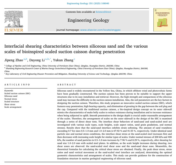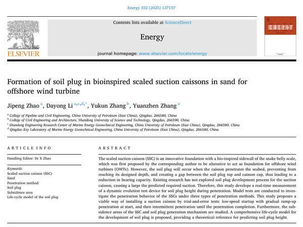 近日,公司李大勇教授团队在海洋能源岩土工程领域中鳞片式吸力基础沉贯特性研究方面取得新进展,相关研究成果《Interfacial shearing characteristics between siliceous sand and the various scales of bioinspired scaled suction caisson during penetration》发表在《Engineering Geology》,《Formation of soil plug in bioinspired scaled suction caissons in sand for offshore wind turbine》发表在《Energy》。《Engineering Geology》和《Energy》分别为工程地质和能源领域顶级期刊(中科院一区Top)。论文第一作者为在读博士生赵继鹏,通讯作者为李大勇教授,williamhill中文官网为第一署名单位和唯一通讯单位。该研究得到国家自然科学基金面上项目资助。