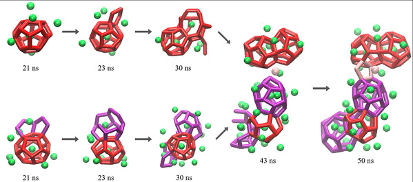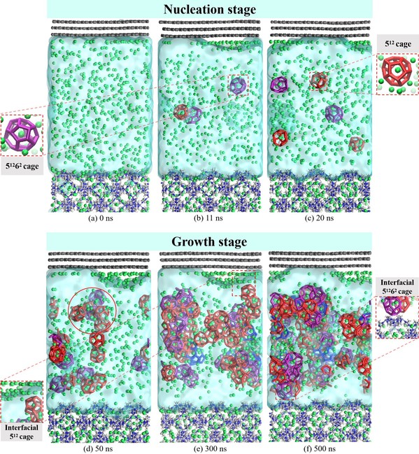 ZIF-8@AC的协同作用对甲烷吸附及吸附诱导的强化促使溶液中多处发生快速的水合物成核过程,由于适宜的扩散系数与高密度的氢键,稳定的水合物晶核快速生长并相互连接,显著提高了水合物生成速率和转换率。通过对水合物生长过程的追踪,揭示了溶液中水合物的快速生长机制,水合物笼通过笼面吸附和笼面共享的方式生长,而ZIF-8@AC的协同作用使得水合物晶核更容易形成大体积的水合物簇,增大其稳定性并加快其生长速率。
