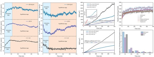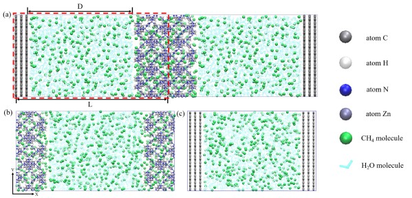本文通过材料复合的方法制备了介孔ZIF-8@AC复合材料,利用ZIF-8与AC间的协同作用以增强吸附-水合耦合特性。为了探究ZIF-8@AC的协同作用对吸附-水合耦合储存甲烷的强化机制,采用分子动力学模拟的方法对ZIF-8@AC孔隙中协同作用对甲烷/水的吸附量、扩散系数、氢键数量、水合物数目、水合物空间演化及生长机制的影响进行了分析。