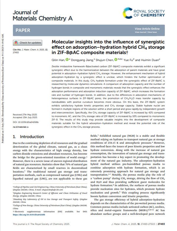 近日,燃气工程系陈树军教授团队在多孔介质吸附-水合耦合储存甲烷微观机制的研究中取得新进展,相关研究成果《Molecular insights into the influence of synergistic effect on adsorption–hydration hybrid CH4 storage in ZIF-8@AC composite materials》发表在《Journal of Materials Chemistry A》,目前影响因子为9.5。论文通讯作者为陈树军教授,第一作者和第二作者为硕士研究生韩其林和蒋东洋,williamhill中文官网为第一署名单位和唯一通讯单位。该研究得到国家自然科学基金面上项目资助。
