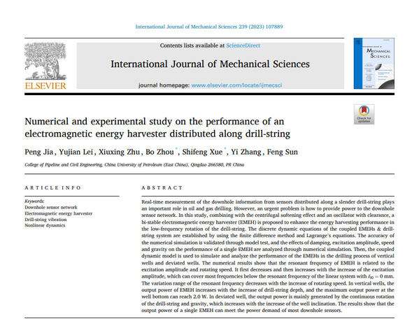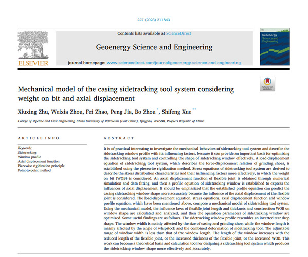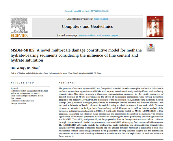 近期,公司周博教授团队在石油与地质工程领域的力学理论与数值方法等方面取得新进展。相关研究成果以“MSDM-MHBS: A novel multi-scale damage constitutive model for methane hydrate-bearing sediments considering the influence of fine”发表在期刊《Computers and Geotechnics》(SCI,中科院1区);以“A semi-analytical method for the stress distribution around a borehole with multiple casings and cement sheaths”和“Mechanical model of the casing sidetracking tool system considering weight on bit and axial displacement”发表在期刊《Geoenergy Science and Engineering》(SCI,中科院2区);以“Numerical and experimental study on the performance of an electromagnetic energy harvester distributed along drill-string”发表在期刊《International Journal of Mechanical Sciences》(SCI,中科院1区);以“A novel shear damage model of the shear deformation and failure process of gas hydrate-bearing sediments”发表在期刊《Journal of Zhejiang University-Science A》(SCI,中科院2区)。
