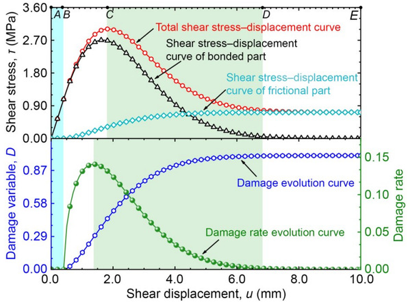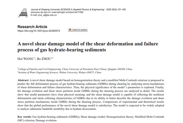研究通过分析剪切变形的微观机制和破坏特征,提出了一种基于均质化理论和改进的Mohr-Coulomb准则的剪切损伤模型,探讨了模型参数的物理意义并详细分析了剪切过程中天然气水合物沉积物内部的损伤演化和剪应力分配规律。结果表明,该剪切损伤模型能够更好地描述天然气水合物沉积物内部在剪切过程中的损伤演化和剪应力分配机制,从而能够反映天然气水合物沉积物的非线性变形和应变软化特性。