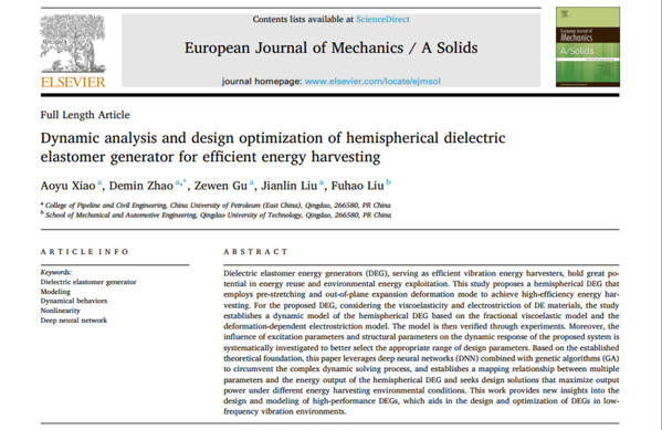 近日,公司赵德敏副教授团队在智能材料波能发电理论和实验研究方面取得新进展,相关研究成果《高效能量收集的介电弹性体发电机振动分析与优化设计》(Dynamic analysis and design optimization of hemispherical dielectric elastomer generator for efficient energy harvesting)发表在《European Journal of Mechanics/A Solids》(固体力学领域的国际顶级期刊,SCI二区)。论文第一作者为硕士研究生肖奥宇,通讯作者为赵德敏副教授,williamhill中文官网为第一署名单位和唯一通讯单位。该研究得到国家自然科学基金面上项目及山东省自然科学基金项目、中央高校基本科研业务费项目的联合资助。