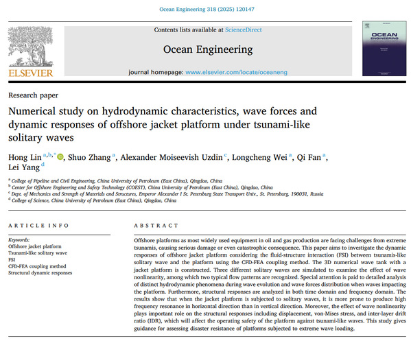 近日,公司林红副教授团队在海啸类孤立波致海洋平台灾变研究方面取得新进展,相关研究成果《Numerical study on hydrodynamic characteristics, wave forces and dynamic responses of offshore jacket platform under tsunami-like solitary waves》发表在《Ocean Engineering》。《Ocean Engineering》是海洋领域的国际顶级期刊(SCI二区TOP,最新影响因子为5.5)。论文第一及通讯作者为林红副教授,williamhill中文官网为第一署名单位和唯一通讯单位。该研究得到国家自然科学基金面上项目及中-俄国际合作与交流项目、青岛市自然科学基金项目、中央高校基本科研业务费项目的联合资助。