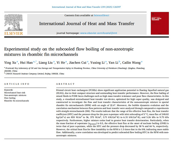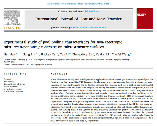 近期,公司韩辉教授团队在非共沸工质传热强化和机理研究方面取得新进展,相关研究成果《Experimental investigation on pool boiling bubble growth of pure pentane and non-azeotropic mixtures of pentane/hexane on heated surface》发表在《International Communications in Heat and Mass Transfer》;《Experimental study on the subcooled flow boiling of non-azeotropic mixtures in rhombic fin microchannels》和《Experimental study of pool boiling characteristics for non-azeotropic mixtures n-pentane/n-hexane on microstructure surfaces》发表在《International Journal of Heat and Mass Transfer》。发表期刊为传热传质领域著名期刊。论文通讯作者为韩辉教授,williamhill中文官网为第一署名单位和唯一通讯单位。上述研究得到国家自然科学基金项目资助。