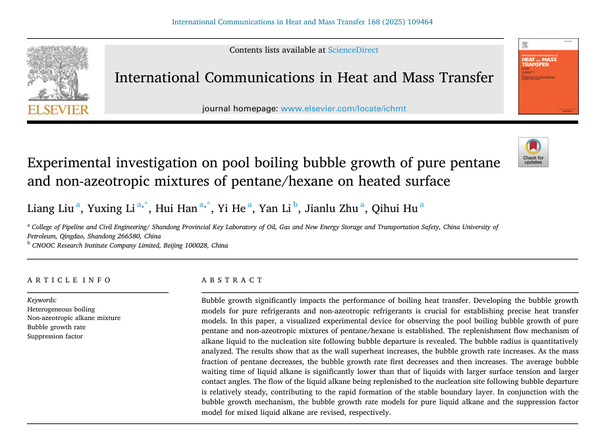 气泡生长对沸腾传热性能具有重要影响,而建立精确的纯制冷剂和非共沸制冷剂气泡生长模型是传热研究的关键。本研究设计了一种可视化实验装置,用于观测池沸腾过程中的气泡生长行为,并揭示了气泡脱离后液态烷烃补充至成核位点的流动机制。实验还表明,液态烷烃的平均气泡停留时间明显短于具有较大表面张力和接触角的液体。气泡脱离后,液态烷烃能快速补充至成核位点,有利于稳定边界层的形成。基于烷烃气泡的生长机理,本研究分别对气泡生长速率模型和抑制因子进行了修正,为混合工质精确传热模型的建立奠定了基础。