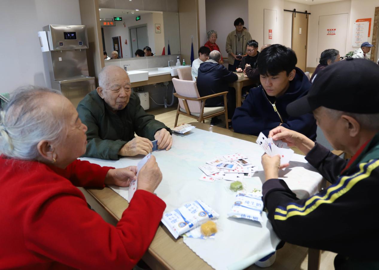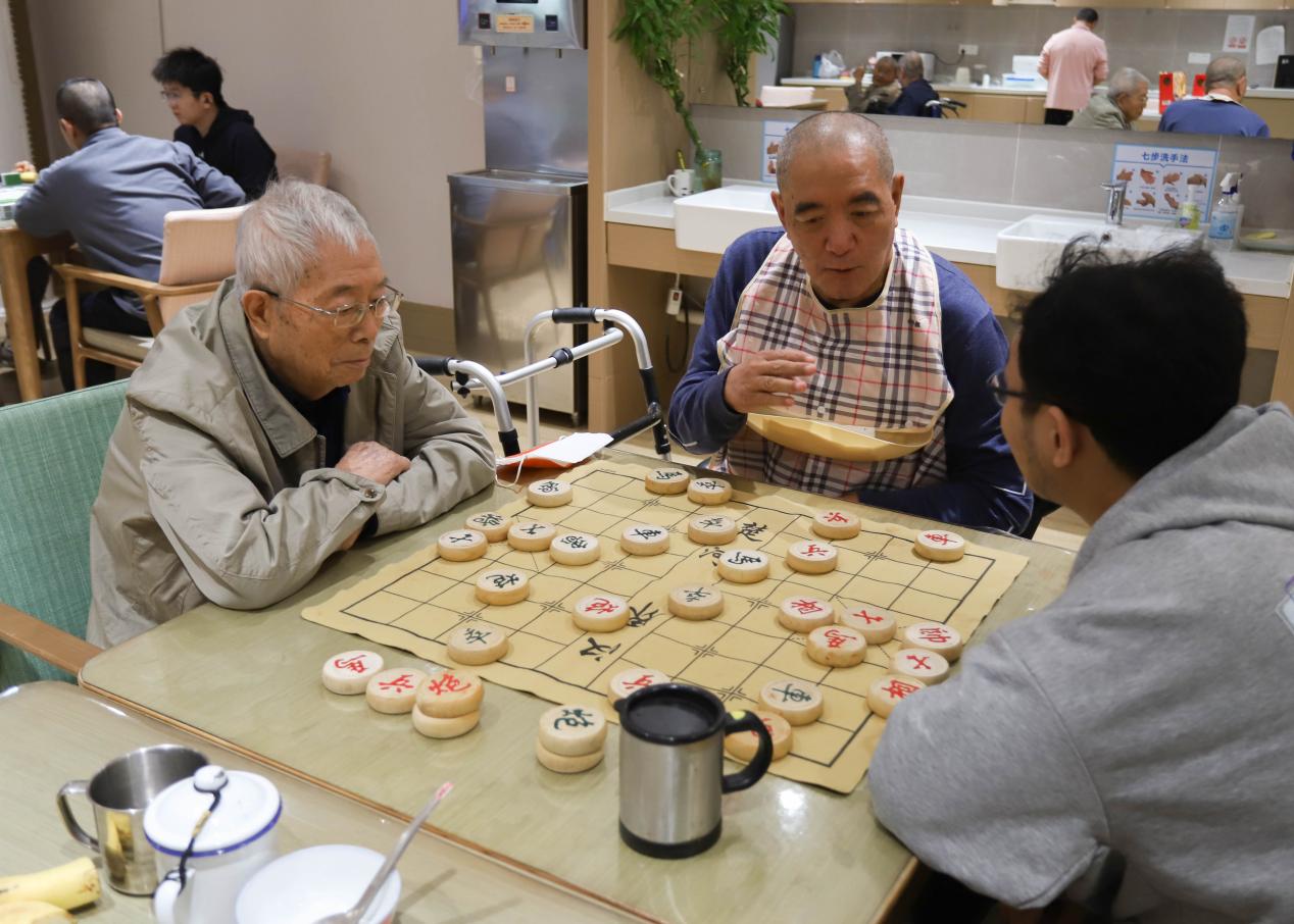 活动休闲区内,麻将桌前,老人们熟练地洗牌、码牌、摸牌,身旁学习的志愿者认真学习、积极互动,现场交流不断,氛围欢快;象棋桌旁,老少双方端坐对弈,落子沉稳,专注思考每一步棋局,精彩对局引得围观者不时点头,阵阵赞许与喝彩声此起彼伏。