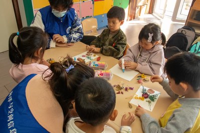 在青岛西海岸新区嘉沐幼儿园,团支部成员带领中班和大班的儿童共同开展重阳节爱老敬老主题活动。团支部成员面向儿童,从数字“九”和农历日期入手,借助古诗与图片,为儿童讲解了“何为重阳”,展示了佩戴茱萸、登高赏秋等传统习俗,阐述了尊老、敬老、爱老的文化内涵。手工环节里,团支部成员指导儿童制作干花拼贴画,并写下对家中长辈的祝福,让孝心一笔一划中传递。