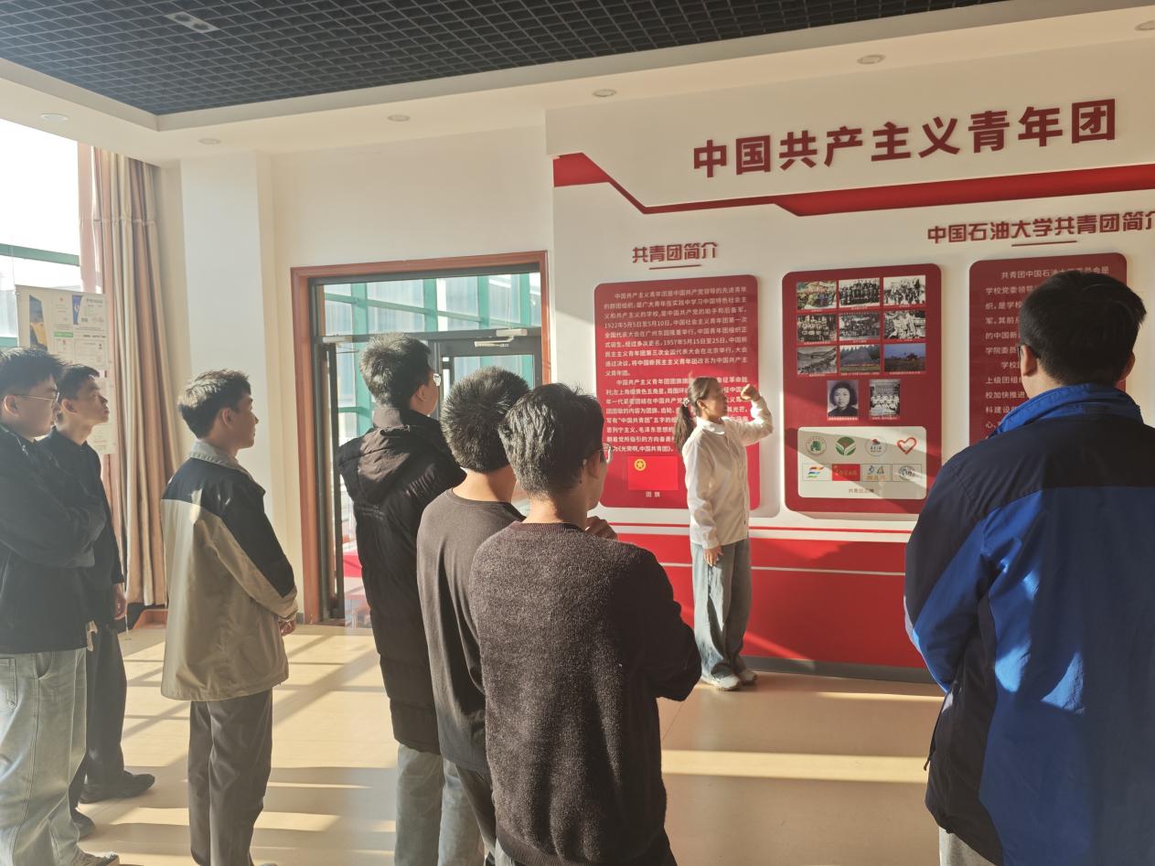 活动伊始,讲解员对支部成员的到来表示热烈欢迎,并围绕共青团的基本概况展开介绍。讲解员从团旗团徽的设计寓意出发,阐释其背后所蕴含的团结、奋斗与进步的象征意义,结合中国石油大学共青团的发展历程,回顾了学校团委在思想引领、组织建设、服务青年等方面取得的积极成效。讲解员鼓励同学们传承“家国同心、艰苦奋斗、惟真惟实、追求卓越”的石大精神,坚定理想信念,锤炼过硬本领,努力成长为担当民族复兴大任的时代新人。
