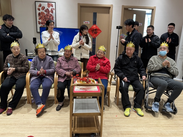 活动伊始,在长者生活照护之家负责人的带领下,储运2301王裕之、尹炫皓同学和研究生张欣同学进入后厨,亲手切水果、打发奶油为过生日的老人做蛋糕。同时,其他员工每人与两位老人组成一组进行手工折纸活动。期间,储运2301孙盛源同学为大家详细讲解了“寿桃”的制作方法。面对“听力下降”“记忆力衰退”的老人,全体成员都展示出了极大的耐心和责任心,和老人一起合作叠好一个个“寿桃”。做完手工后,同学们纷纷与老人合影留念,还和老人互唠家长里短,关心彼此身体健康。随后,同学们为过生日的六位老人带上生日礼帽,王裕之也推着蛋糕入场。在场的全体成员一起为老人们唱响“生日快乐歌”,现场气氛一派喜气洋洋。