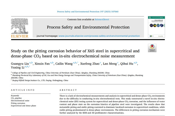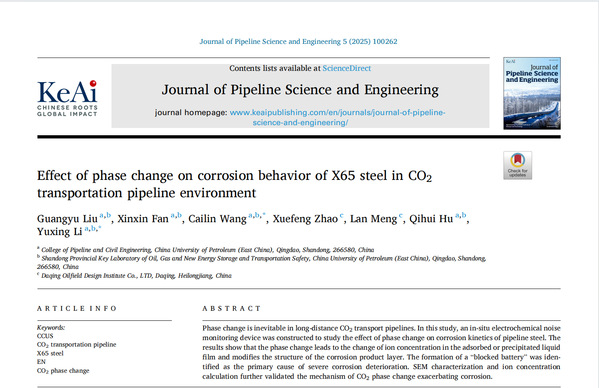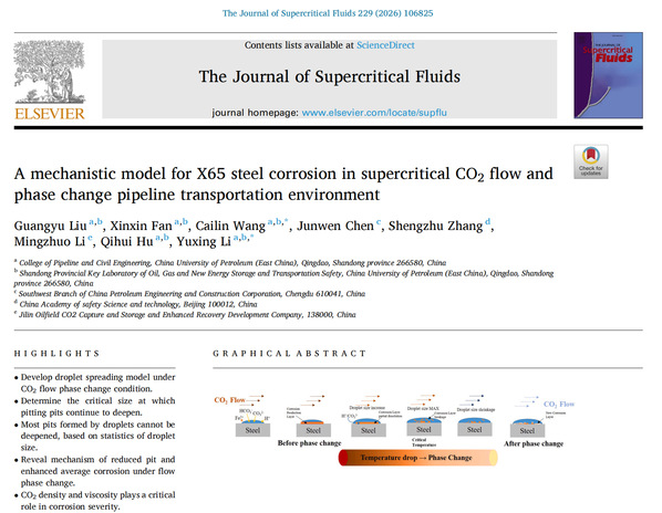 近期,公司王财林副教授团队在超临界CO2输送管道内腐蚀研究方面取得多项成果。相关研究成果《Corrosion susceptibility of different microstructural zones in X65 steel weld joints under supercritical CO2 environment》发表在《Corrosion Science》、《Study on the pitting corrosion behavior of X65 steel in supercritical and dense-phase CO2 based on in-situ electrochemical noise measurement》发表在《Process Safety and Environmental Protection》、《Effect of phase change on corrosion behavior of X65 steel in CO2 transportation pipeline environment》发表在《Journal of Pipeline Science and Engineering》、《A mechanistic model for X65 steel corrosion in supercritical CO2 flow and phase change pipeline transportation environment》发表在《The Journal of Supercritical Fluids》。其中,《Corrosion Science》是腐蚀研究领域的国际顶级期刊(SCI一区TOP)。论文通讯作者为王财林副教授和李玉星教授,williamhill中文官网为第一署名单位,第一作者为分别为博士生刘广瑜和硕士生范鑫鑫。上述研究得到了国家自然科学基金及山东省自然科学基金等项目资助。
