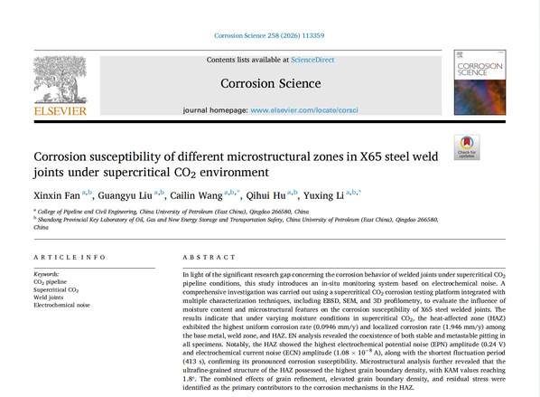 在超临界CO2管道焊接接头腐蚀行为研究中,从组织结构-腐蚀演化-微观机制三个层面研究了含水量对X65钢焊接接头在超临界CO2条件下腐蚀行为的影响,揭示了超临界CO2环境下X65钢焊缝不同组织区的腐蚀机理,通过电化学噪声原位监测与多尺度组织分析的结合,构建了“组织特征-应力分布-腐蚀敏感性”的耦合模型,为CO2输送管道的安全评估与防护设计提供了理论依据。