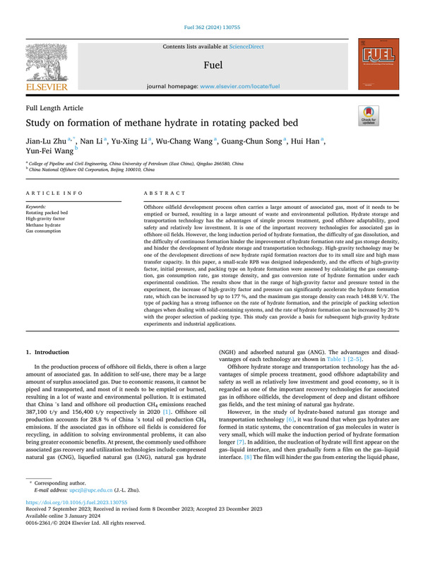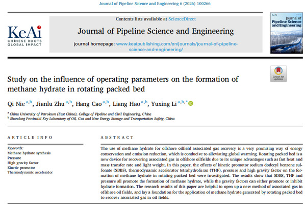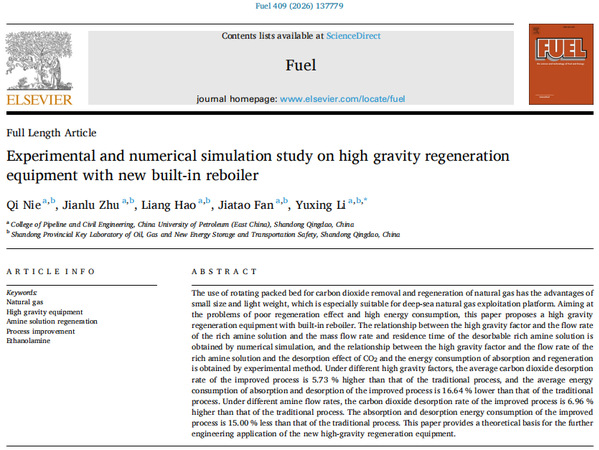近日,公司朱建鲁教授团队在超重力脱碳研究方面取得新进展,相关研究成果《Study on formation of methane hydrate in rotating packed bed》、《Decarbonization absorption of ship exhaust gas and solvent regeneration by a high-gravity method》、《Experimental and numerical simulation study on high gravity regeneration equipment with new built-in reboiler》发表在《Fuel》。《Study on the influence of operating parameters on the formation of methane hydrate in rotating packed bed》发表在《Journal of Pipeline Science and Engineering》。《Fuel》是能源研究领域的国际著名期刊(SCI 二区TOP)。《Journal of Pipeline Science and Engineering》是油气储运领域的国际著名期刊(SCI 二区)。论文主要作者为朱建鲁教授、博士研究生聂琦和硕士研究生李楠,williamhill中文官网为第一署名单位。该研究得到工业和信息化部基金项目和山东省自然科学基金项目联合资助。