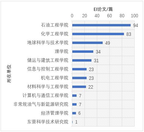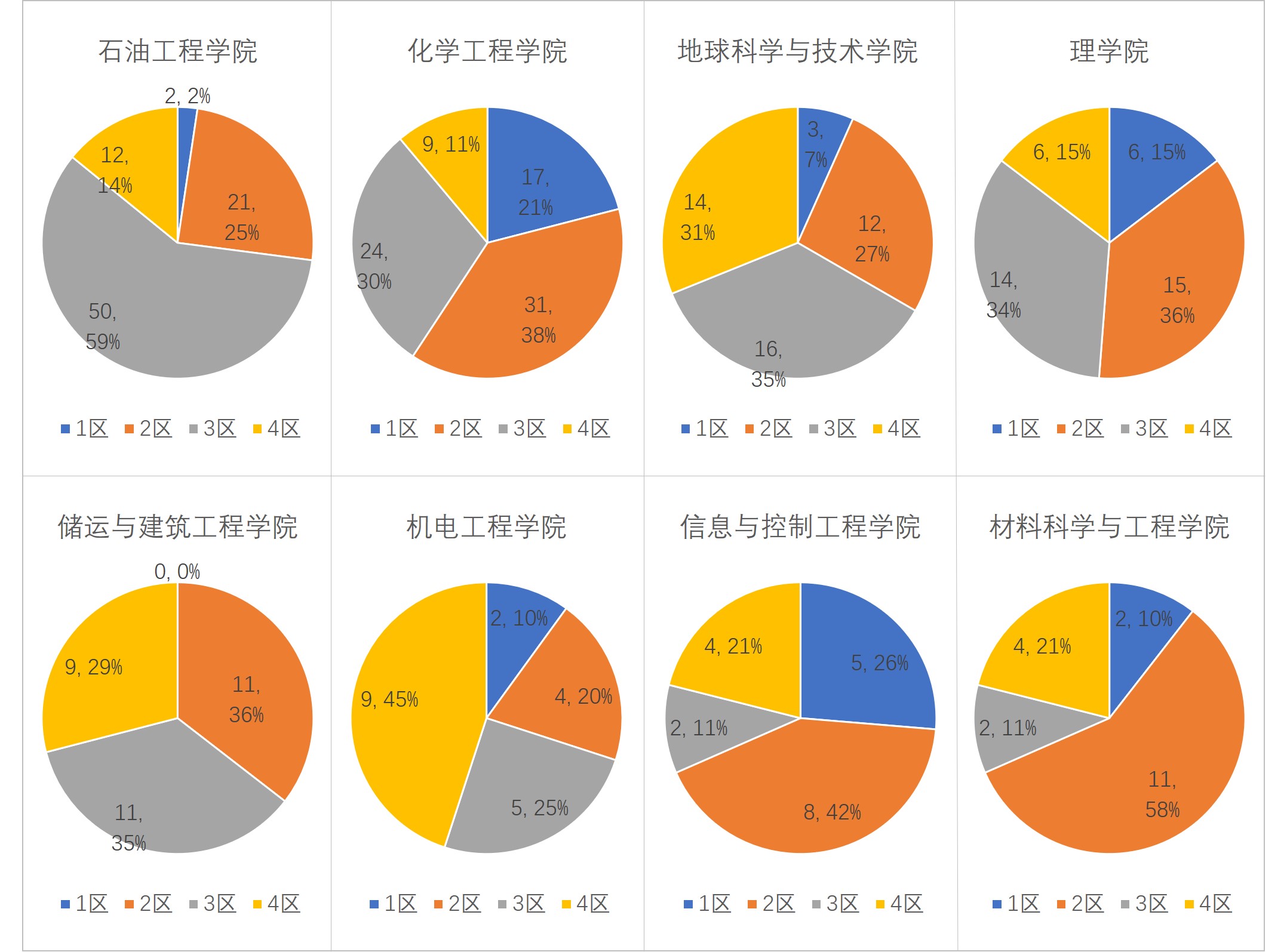 图中数字为论文篇数,占比。例如石油工程学院1区论文2篇,占比2%